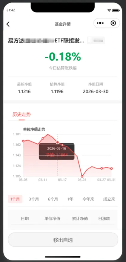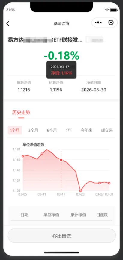 笔者继续向AI描述问题、迭代调试,基本实现了核心功能,但依然存在一个棘手的瑕疵:基金详情页的历史净值走势图表,数值提示框被相关图层遮挡,无法很好的显示。