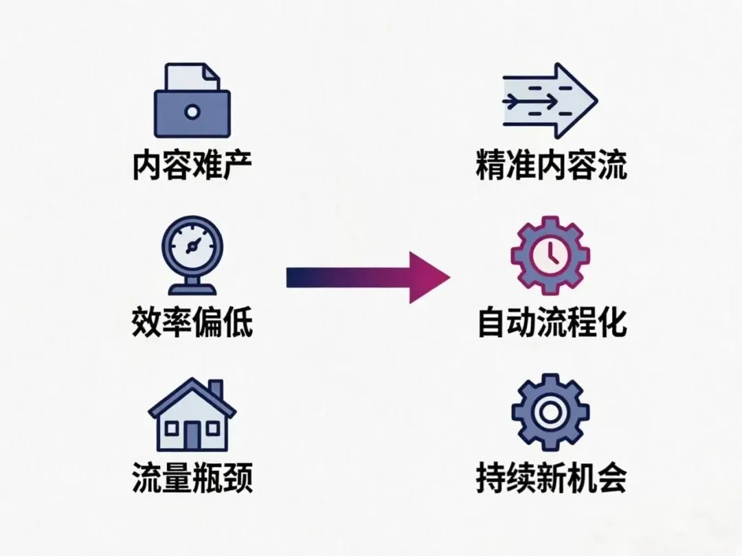 客服响应滞后、内容创作同质化、运营数据碎片化、人力成本高、流程繁琐……