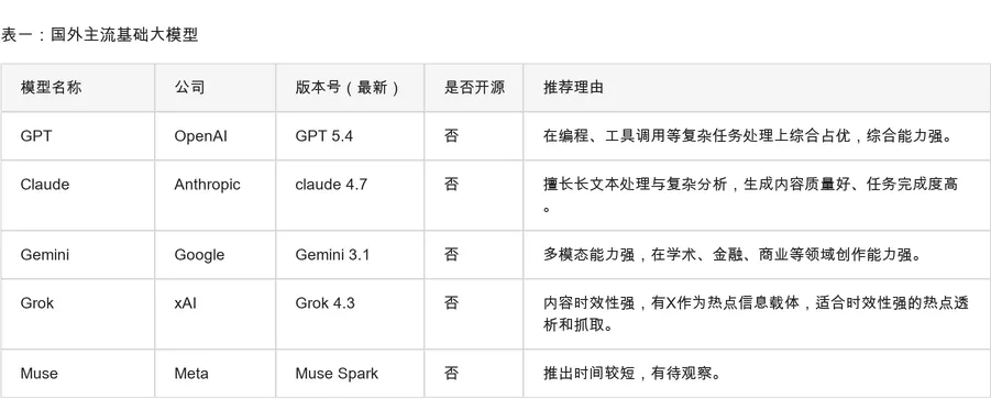 表一:国外主流基础大模型: