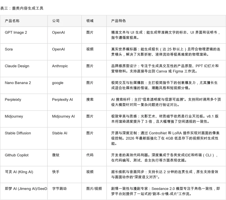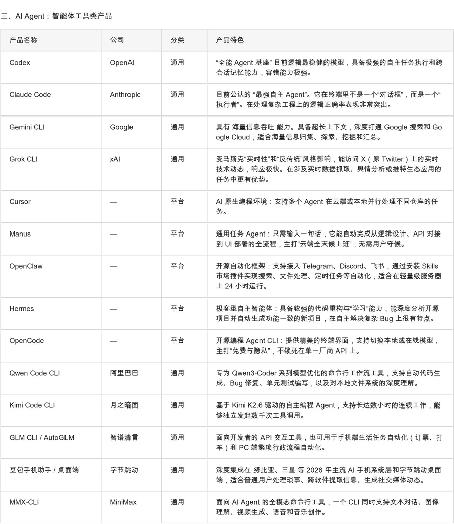 整体的梳理逻辑,我会按照基础大模型、内容生成工具、AI Agent等三个视角来划分,每个类别,会分别梳理出国内外的头部模型和产品作为代表性参考。