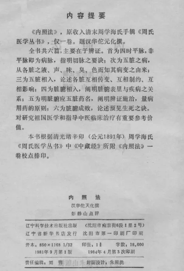 免费下载《内照法》(汉)华佗撰,中医藏象著作