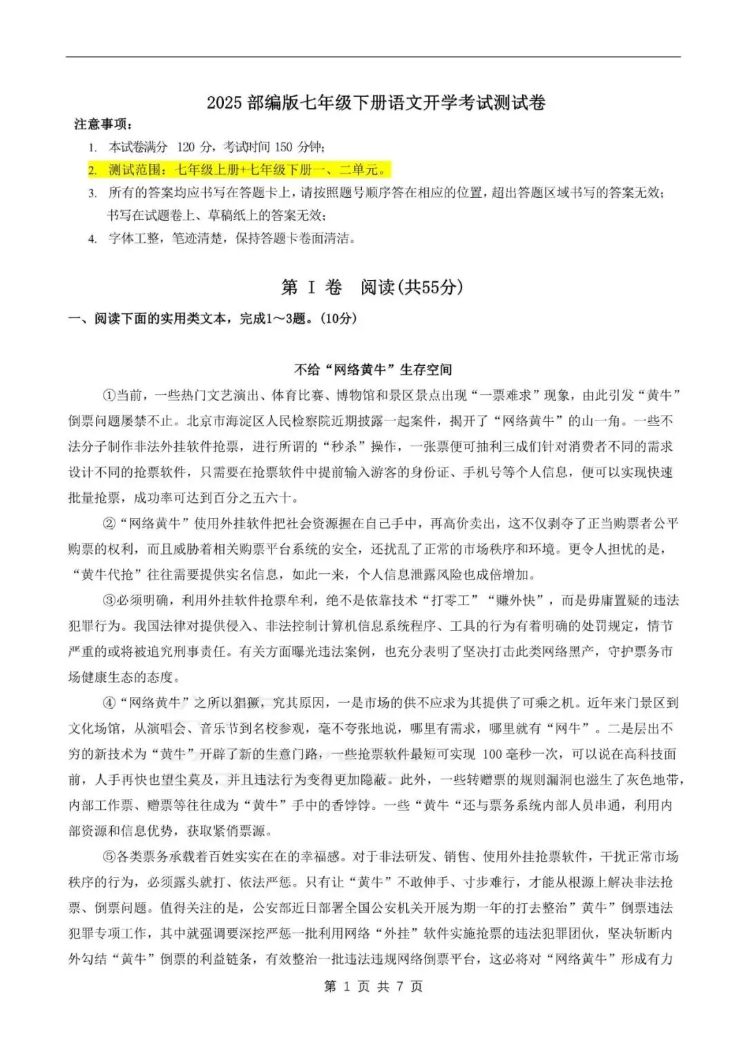 今天老师给大家整理了:七年级下册语文开学考试卷(完整版)含详细解析,电子打印版!