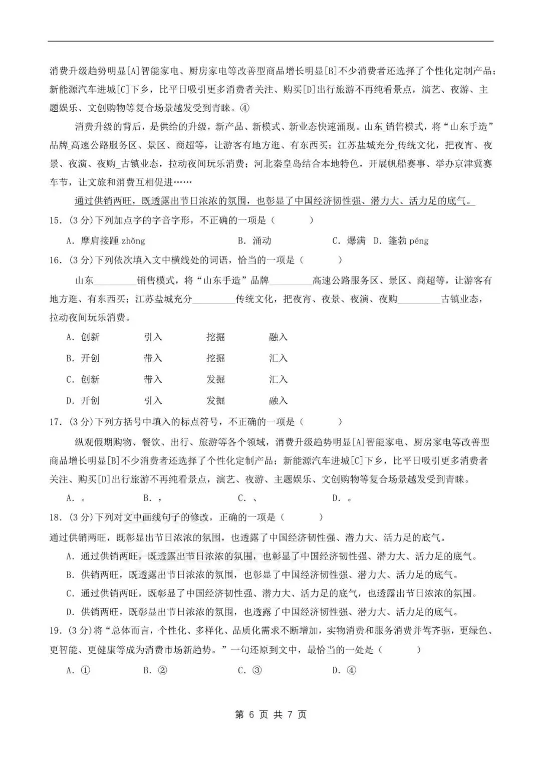 七年级下册语文开学考试卷(完整版)含详细解析,电子打印版!