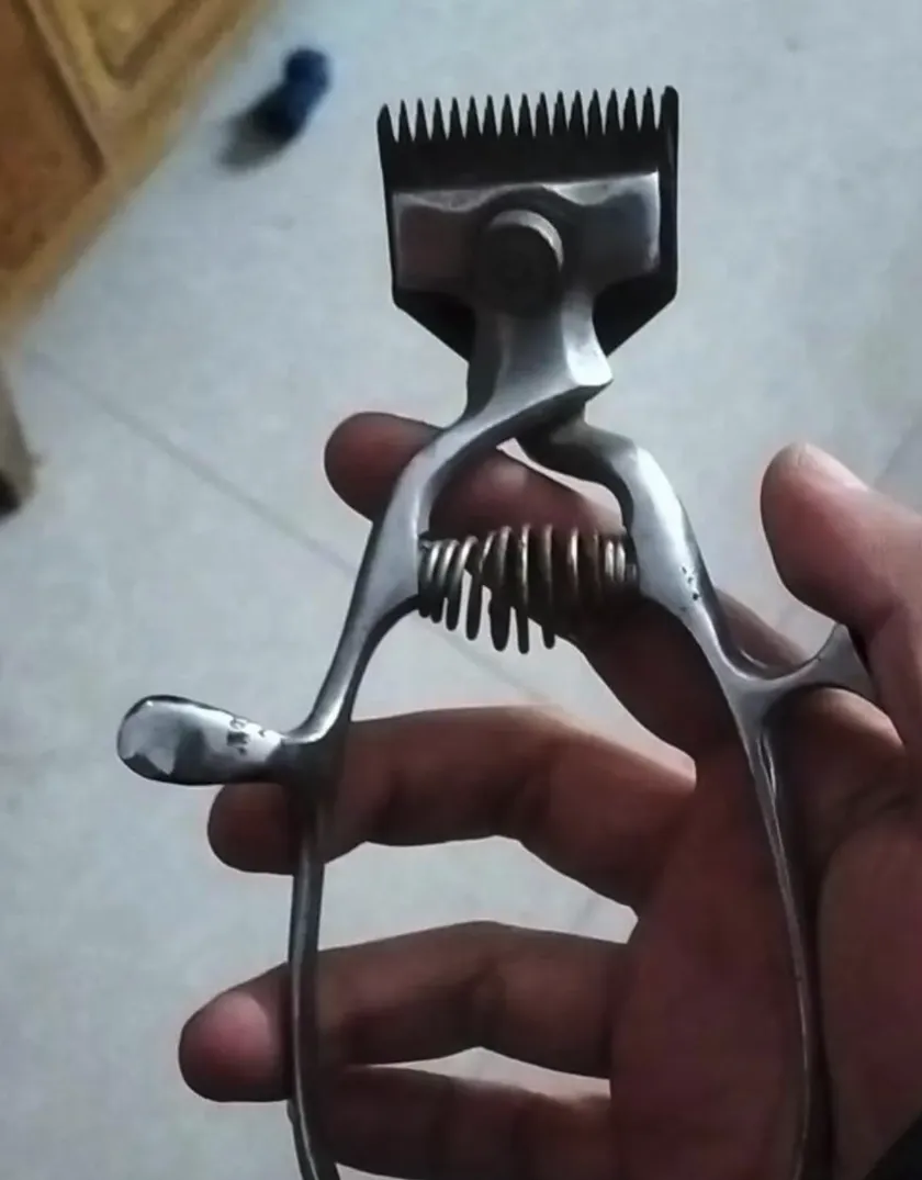 这个金属夹子叫剃头推子,春秋换季,理发店师傅手上离不开这物件,两片钢齿对着头皮,一推一拉咯吱咯吱响,小时候不爱剃头就怕卡头发,疼得直咧嘴,爷爷还说“忍一忍,干净”,家里没人会用电推剪,只有它靠谱,后来换成电动的,这声响再也听不见了。