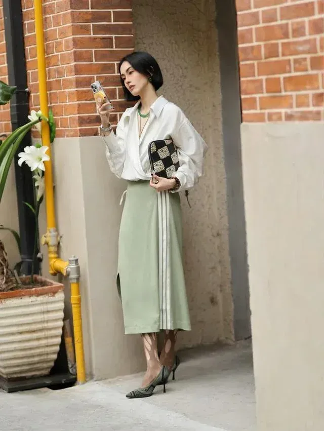 像图1那条浅烟绿色半裙,正面看很安静,真正在起作用的是侧边那两道白条。它把视线从腰侧一路往下拽,等于悄悄给裙子加了一根“骨头”,所以这条裙虽然软,但不散。上面再接一件松一点的白衬衫,松和直就有了分工:衬衫负责透气,裙侧线负责收住。