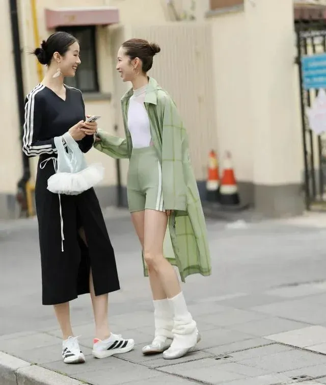 而图2那种“双人同框”尤其有意思。一个是黑色条纹长裙,一个是浅绿骑行短裤外加透感长衬衫,风格明明不同,但放一起居然不打架。为什么?因为两个人都抓住了同一个核心——侧线条+轻量感鞋子+收干净的发型。这种统一,不靠logo喊话,靠的是审美系统已经成熟了。