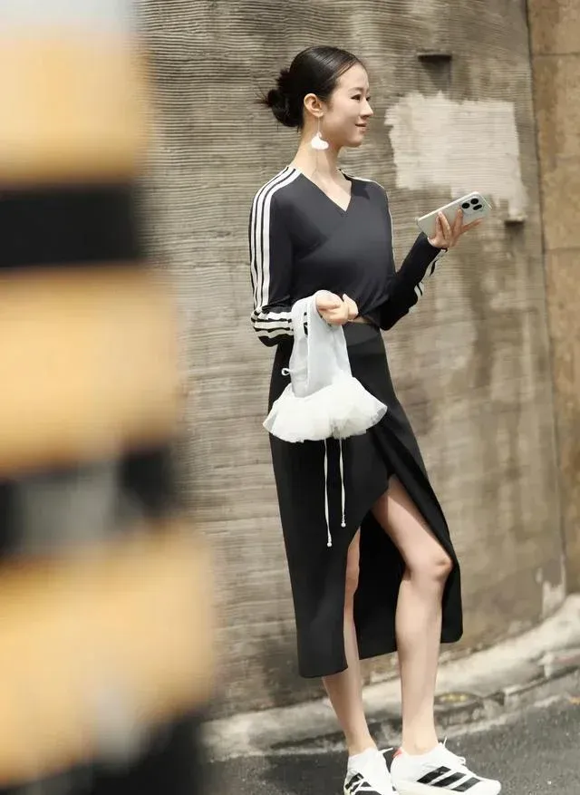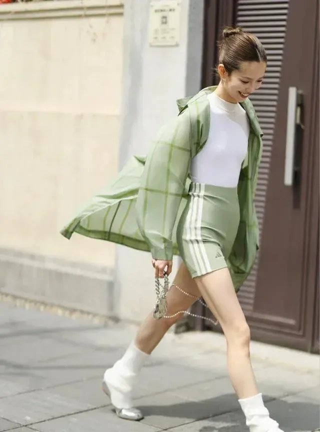 我这次反复看的,不是某一件有多华丽,而是那几道侧边条纹。它本来是很运动的语言,但放到薄荷绿开衩半裙、修身针织裙、甚至短裤套装里以后,味道完全不一样了。🔍