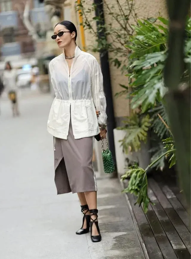 图4那件半透白色外套就很典型。外套本身有一点中式立领的影子,可它没有做得很满,前中拉链、腰部抽绳、下摆微微散开,等于把古典感拆薄了。下面接一条灰紫调裹身裙,脚上却是绑带方头鞋,露肤点集中在颈部、脚背和小腿前侧,所以你不会觉得闷,反而会觉得这套很会“收”。如果这里换成一双厚重靴子,整套重心马上往下坠,那种清劲就没了。