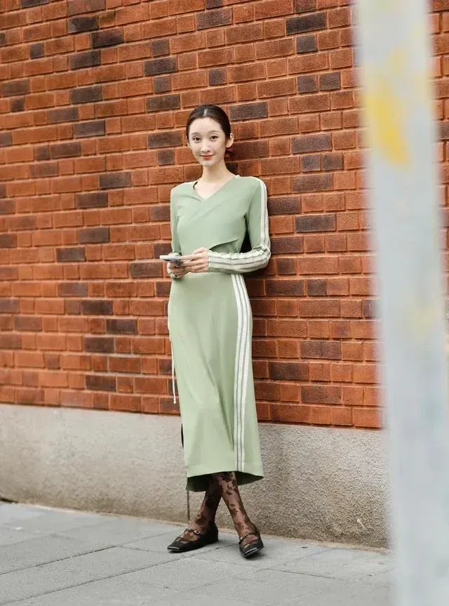 图5也一样,长袖针织裙看着包得多,但V领、袖子的拼接条纹、侧开衩,再加一双半透明花纹袜,露和不露都卡在刚好的位置。这个“刚好”比一味强调曲线耐看太多。❌ 我以前穿类似长裙老觉得自己被布料吞掉,后来发现问题不在裙长,而在于领口、脚踝、手腕一个都没松开。