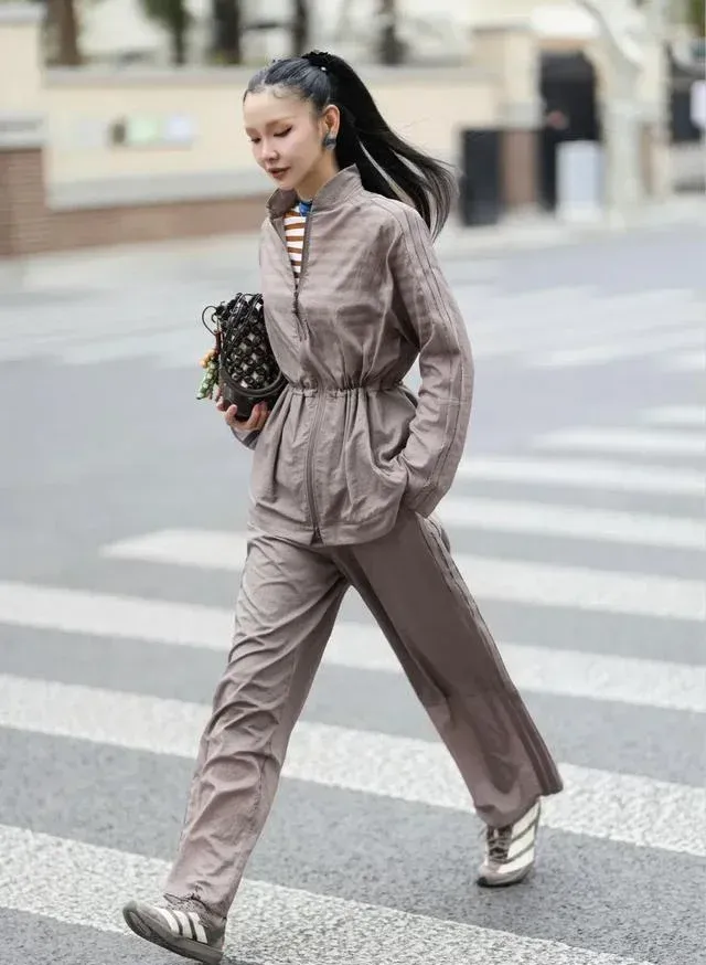 图3那套灰褐色运动套装,单看设计其实不复杂,拉链、抽绳、侧边线条,都是常见元素。但它妙就妙在面料不是软塌塌地贴在身上,而是有一点干爽的筋骨。走起来裤腿会摆,可不会缠腿;腰部抽紧以后也不是皱成一团,而是能稳稳卡住重心。旁边那只编织感很强的小包一放,都市感立刻就出来了。💡