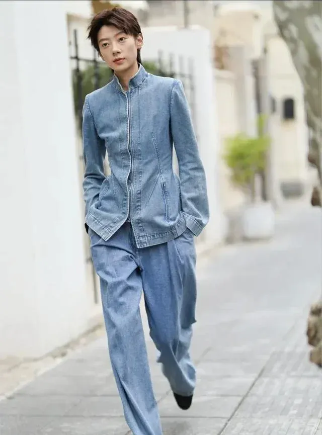图6的牛仔套装更能说明问题。很多人觉得牛仔做新中式容易硬,可这套不是靠印花或盘扣去提醒你“这是中式”,它是用立领、向内收的腰线、往下顺开的下摆把轮廓立起来,再用水洗牛仔把距离感拉回日常。这个思路我很喜欢:不是把传统符号缝在表面,而是把传统的“身形秩序”藏进剪裁里。