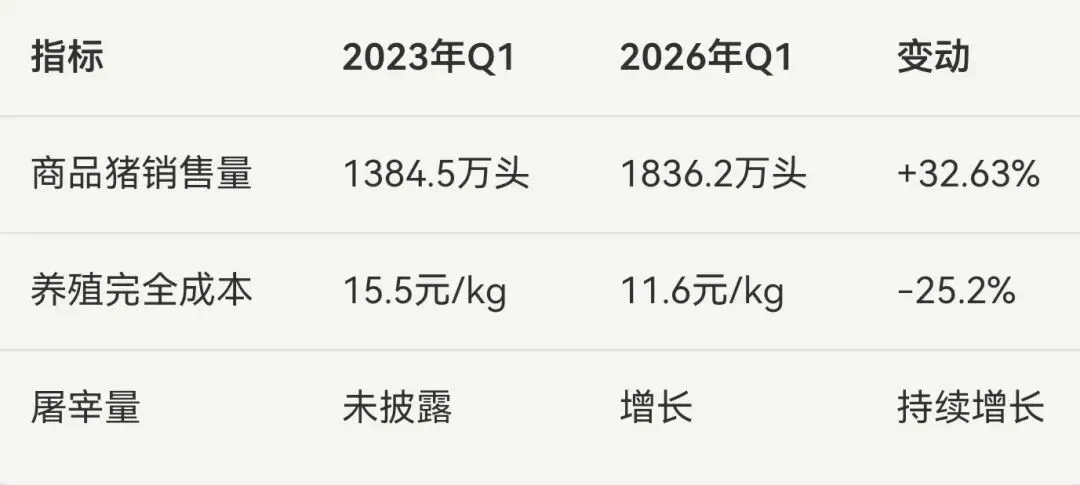 2023年Q1,归母净利润亏损11.98亿元;2026年Q1,归母净利润亏损12.15亿元。三年间出栏量增长32.6%,亏损几乎持平。