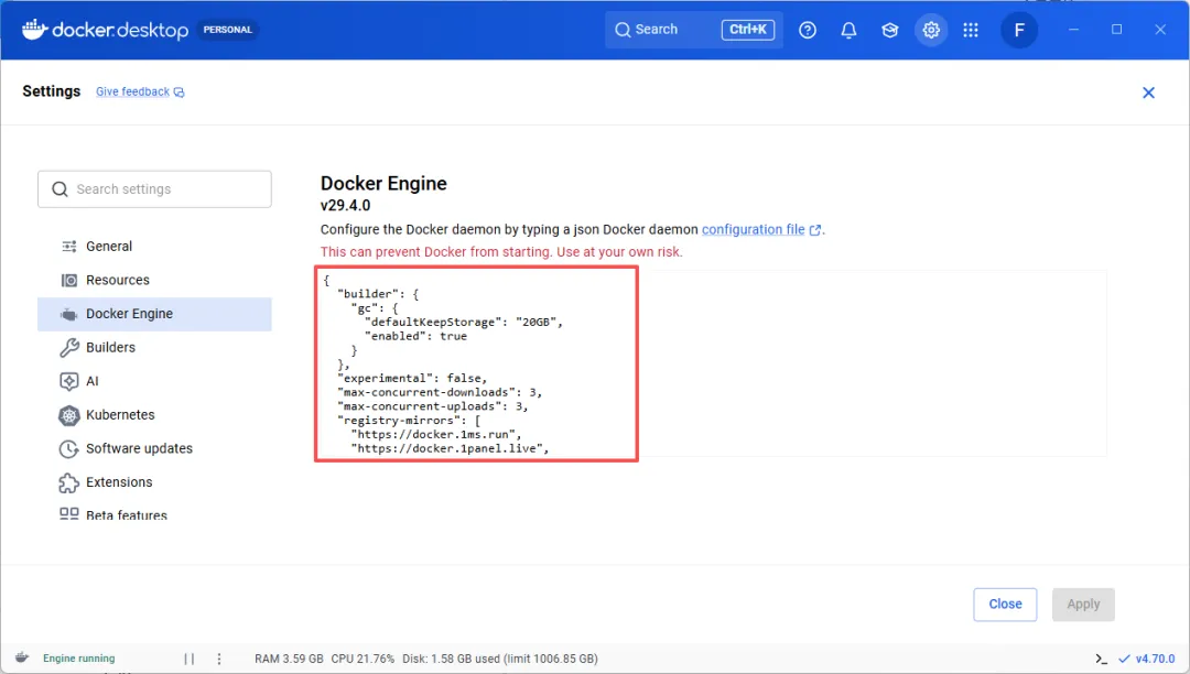 安装Docker后,配置一下镜像加速(不然下载慢)👇