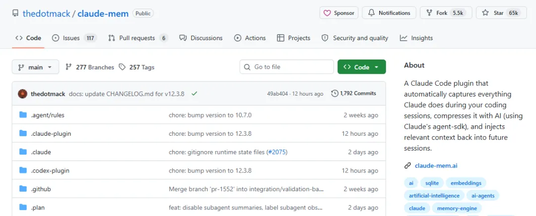 项目叫 claude-mem,最近在GitHub上火得有点离谱——目前已有 64,959 个⭐,上周单日新增将近2000颗星,是这一轮GitHub热榜中Star数最高的工具之一。