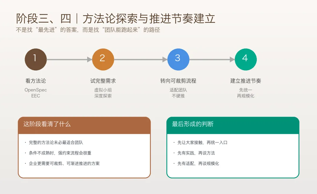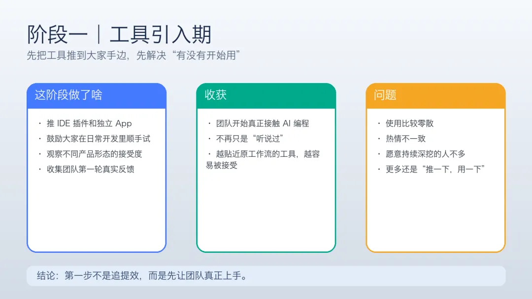 从工具引入,到统一工作流,再到开始尝试方法论,本质上是在一层层把团队真正带进来。