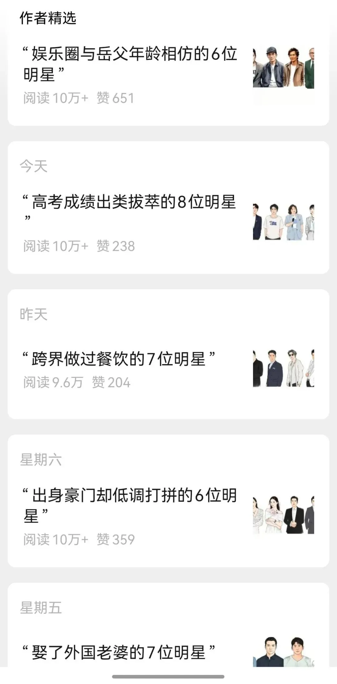1、我昨天刷到一个公众号博主。从5月下旬开始,他开始更新明星类文章,接着就炸了。
