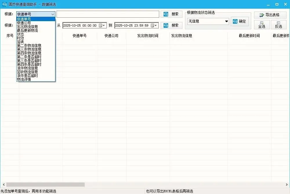 •多维度筛选:支持按快递单号、快递公司、物流状态、查询时间等多条件组合筛选,可精准定位目标快递信息,提升数据整理效率。