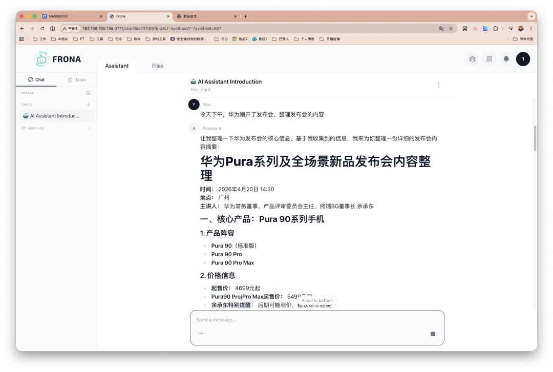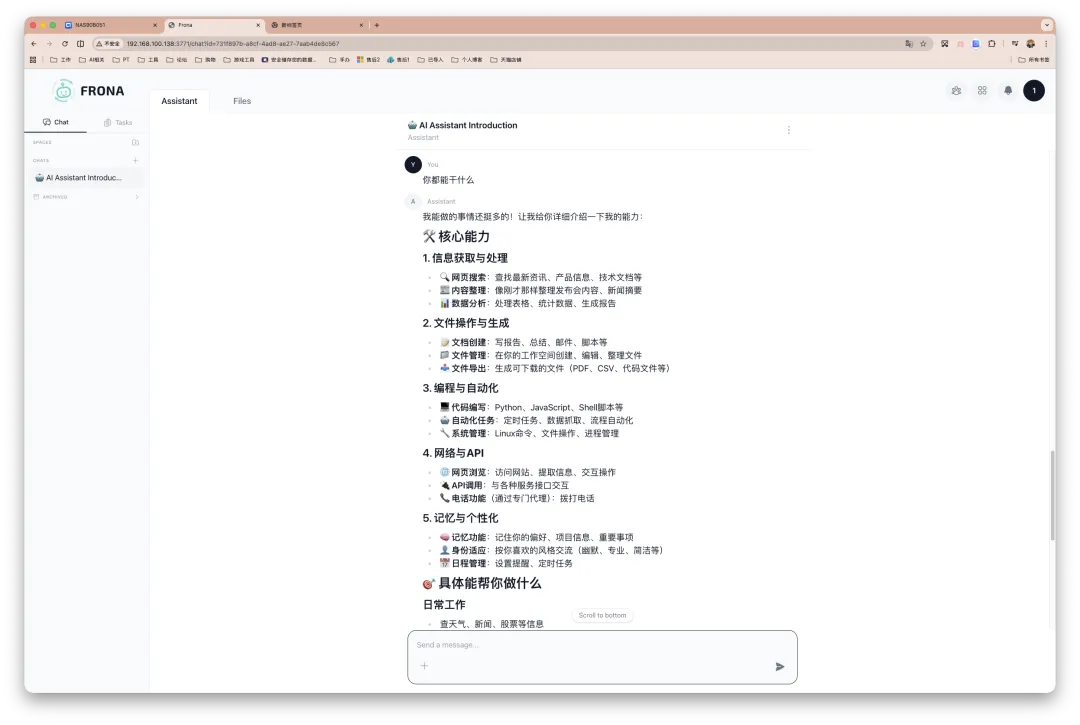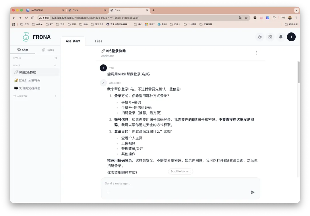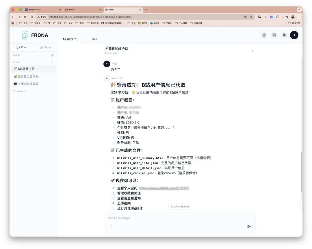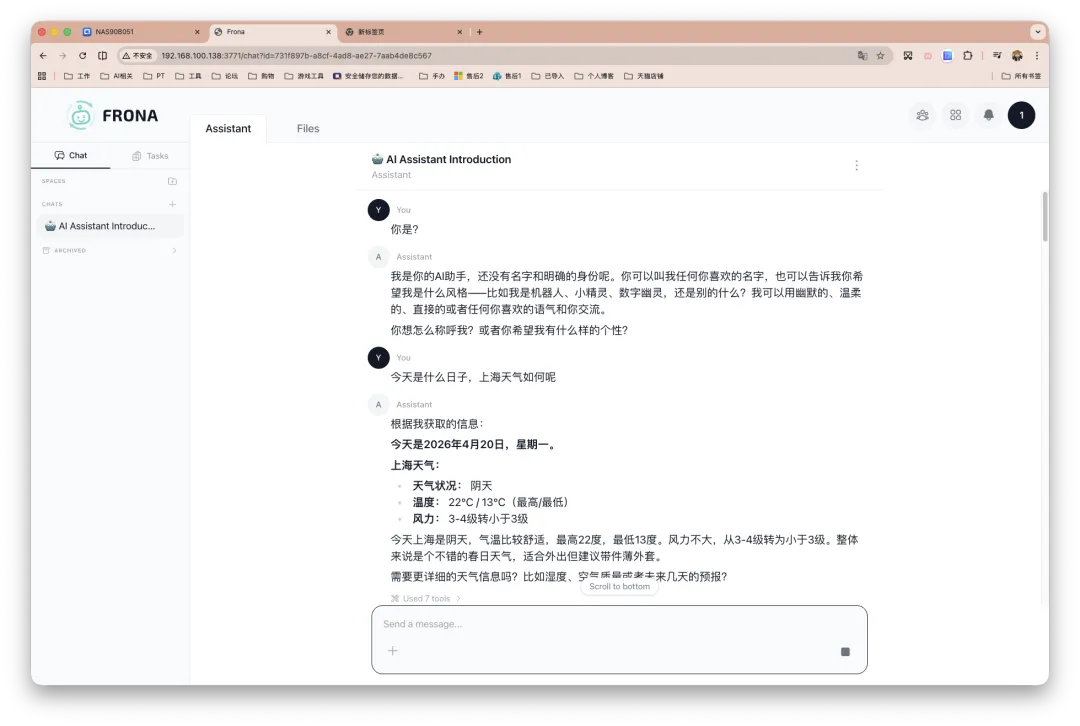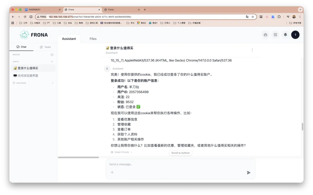 Frona 可能并不是一个万能解法,但就满足我的实际需求而言(大量依赖 AI 实时浏览和读取网页,包括跟进科技新闻、整理 NAS 与 Docker 相关玩法内容,以及处理各类需要登录和交互的网站场景,比如平台和 PT 站点打卡等),他带来的帮助的确是成立的。