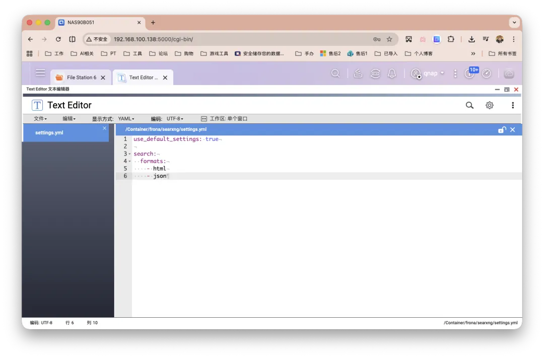 再创建 SearXNG 配置文件,我这里是在/share/Container/frona/searxng/settings.yml,填入以下内容