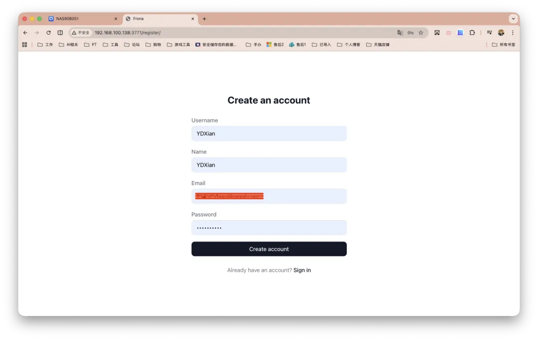 在你的 NAS 共享文件夹里建一套目录,例如威联通我习惯/share/Container/frona。如果你的共享文件夹不叫 Container,把文章后续 YAML 里的路径全部替换成你自己的实际绝对路径就行。