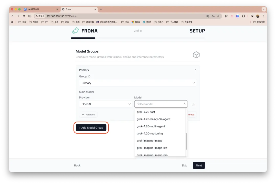 步骤二、接着点击「Add Model Group」,所有的模型会自动读取。可分别指定主要模型、推理模型和编码模型。