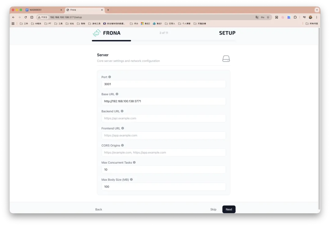 步骤三、接着填写服务相关,第二个访问地址,如果已经反代并配置证书,这要填写https以及反代后的域名,国内用不了标准443端口的,别忘记补好Lucky之类的监听端口。「Max Concurrent Tasks」默认值为10,建议填写2或3,官方文档提到 Browserless 是最耗资源的组件,每个并发浏览器会话大约占 200–500MB RAM。因此建议服务器至少4GB内存。NAS部署先保守点,稳定后续再上调。