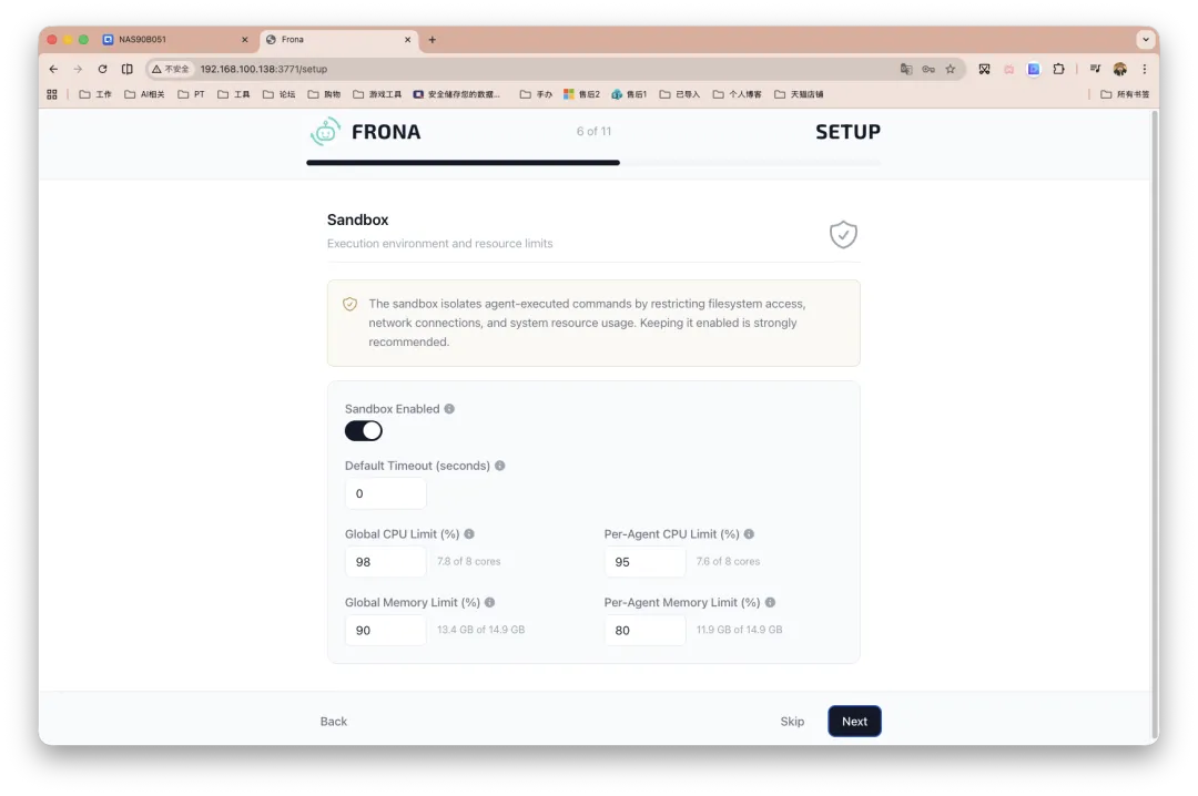 步骤六、这一项也保持默认(注意端口号是否匹配),官方也明确建议 生产环境保持沙箱开启。沙箱会限制 agent 的文件系统访问、网络访问和资源占用;如果关闭,agent 执行的命令将不再受这些限制。