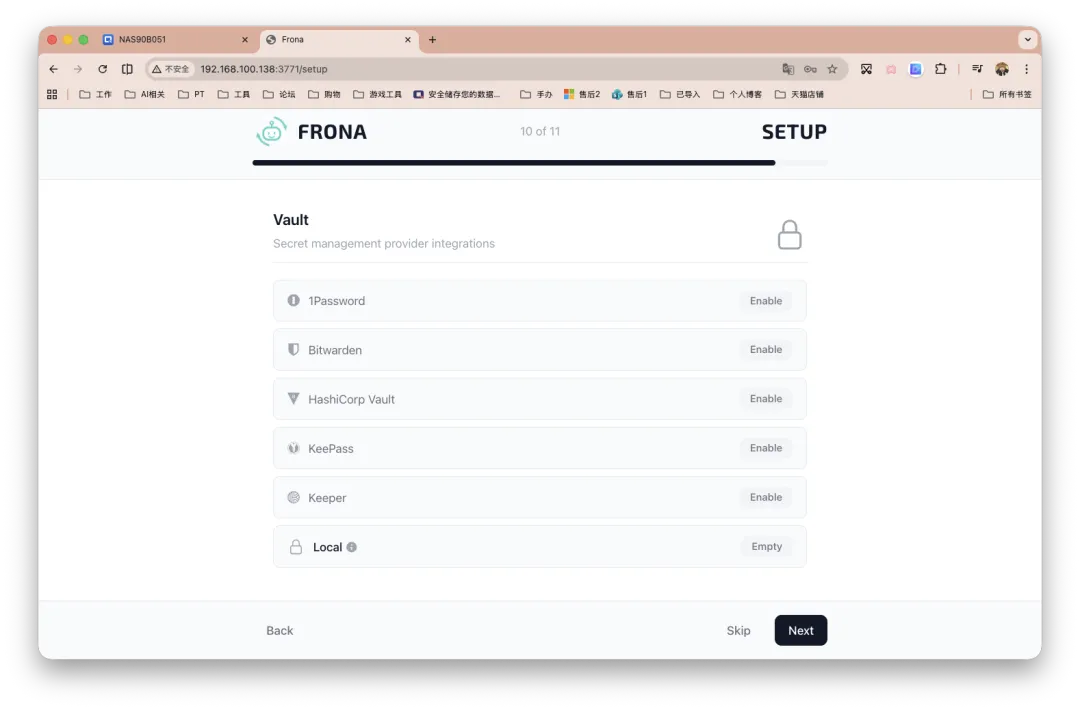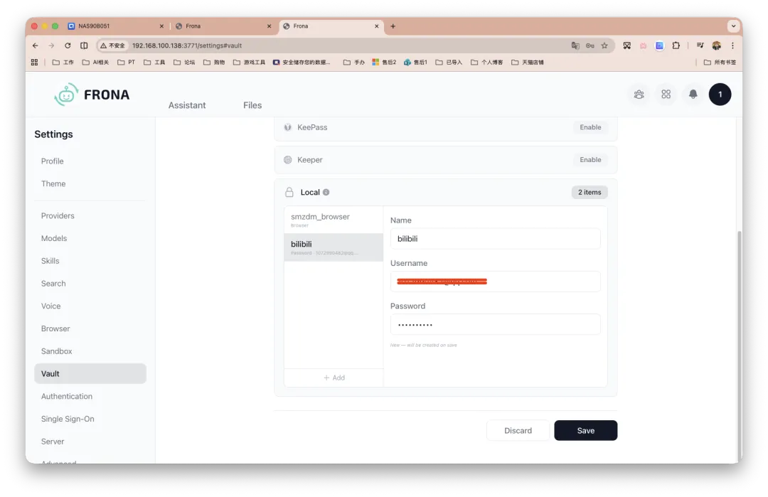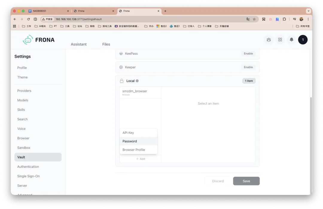 步骤十、是密钥库/凭证管理页面,除了本地,大家外部服务比较熟悉的应该是Bitwarden和1Password,我之前也分享过搭建流程。服务连接也不难。如果大家要配合登陆网页服务之类,推荐搞搞。