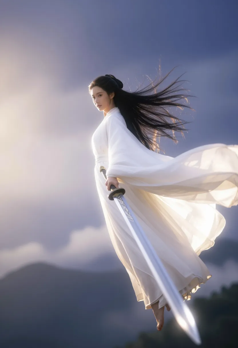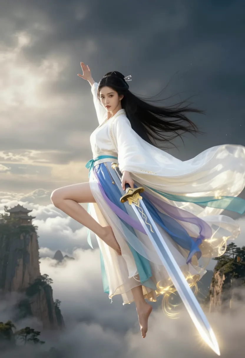 这个场景展现了8K超高清,极致细节,杰作,最佳画质,奇幻摄影,剑仙艺术风格,亚洲女性剑仙御剑飞行,穿着优雅白色仙侠…画面构图精妙,光影运用恰到好处,充分展现了主角的魅力与气质。无论是服装细节还是环境氛围,都经过了精心的设计与布置。