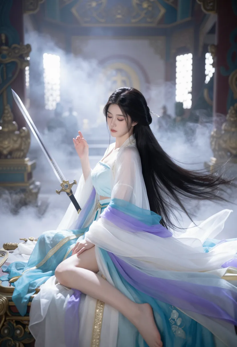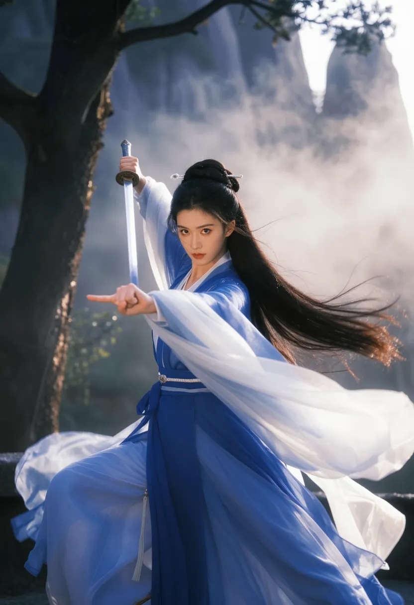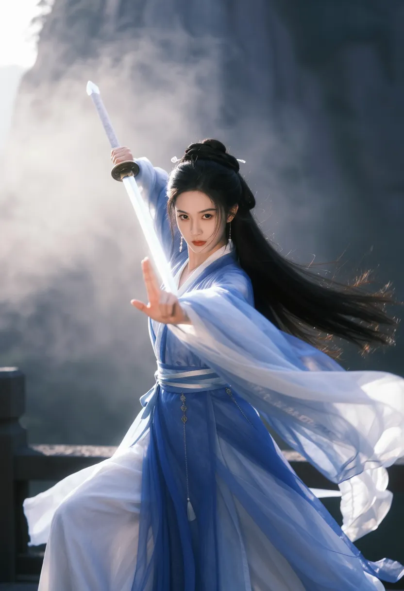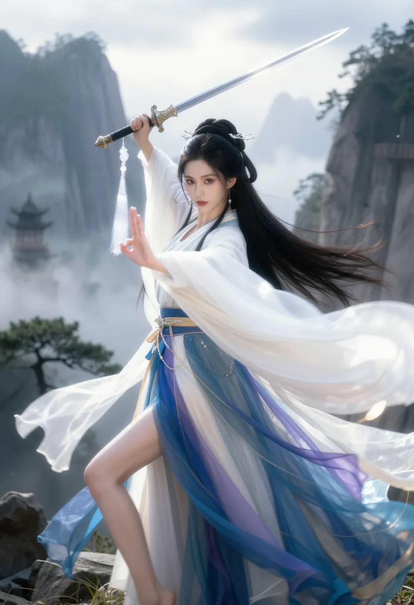 这个场景展现了8K超高清,极致细节,杰作,最佳画质,动作摄影,练剑艺术风格,亚洲女性在仙山上练剑,穿着优雅蓝色仙侠…画面构图精妙,光影运用恰到好处,充分展现了主角的魅力与气质。无论是服装细节还是环境氛围,都经过了精心的设计与布置。