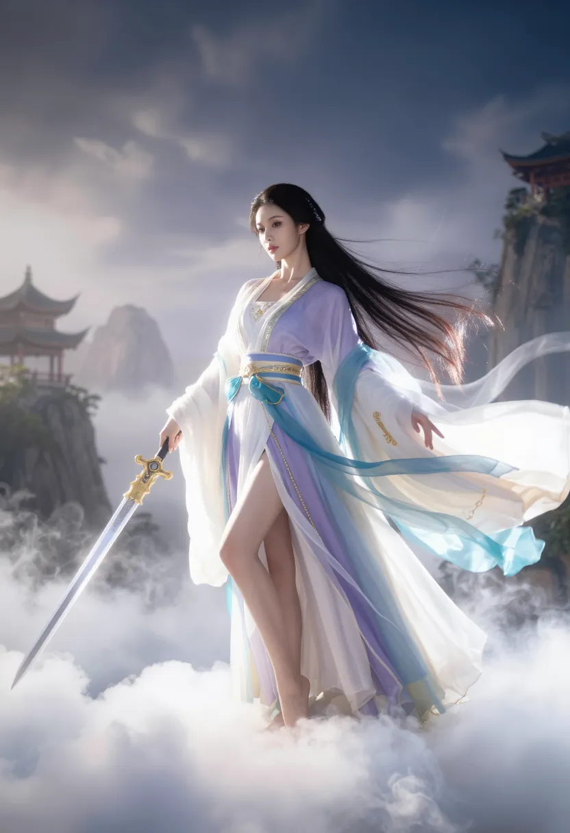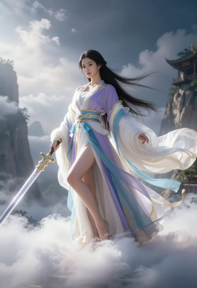 8K, ultra-detailed, masterpiece, best quality, portrait photography, cloud standing art style, Asian female standing on clouds, wearing elegant purple immortal robe with golden trim, long black hair cascading naturally, graceful and seductive pose, standing on cloud platform with one hand holding immortal sword, other hand at side, body in elegant standing pose, natural expression with serene gaze, ethereal cloud setting with floating clouds and sky, soft cloud light with mist, low angle shot from side, sharp focus on body and face, soft focus on cloud background, dramatic lighting from clouds creating rim light, transcendent atmosphere, celestial color palette (purple, white, gold, blue), 35mm f1.8, cinematic composition