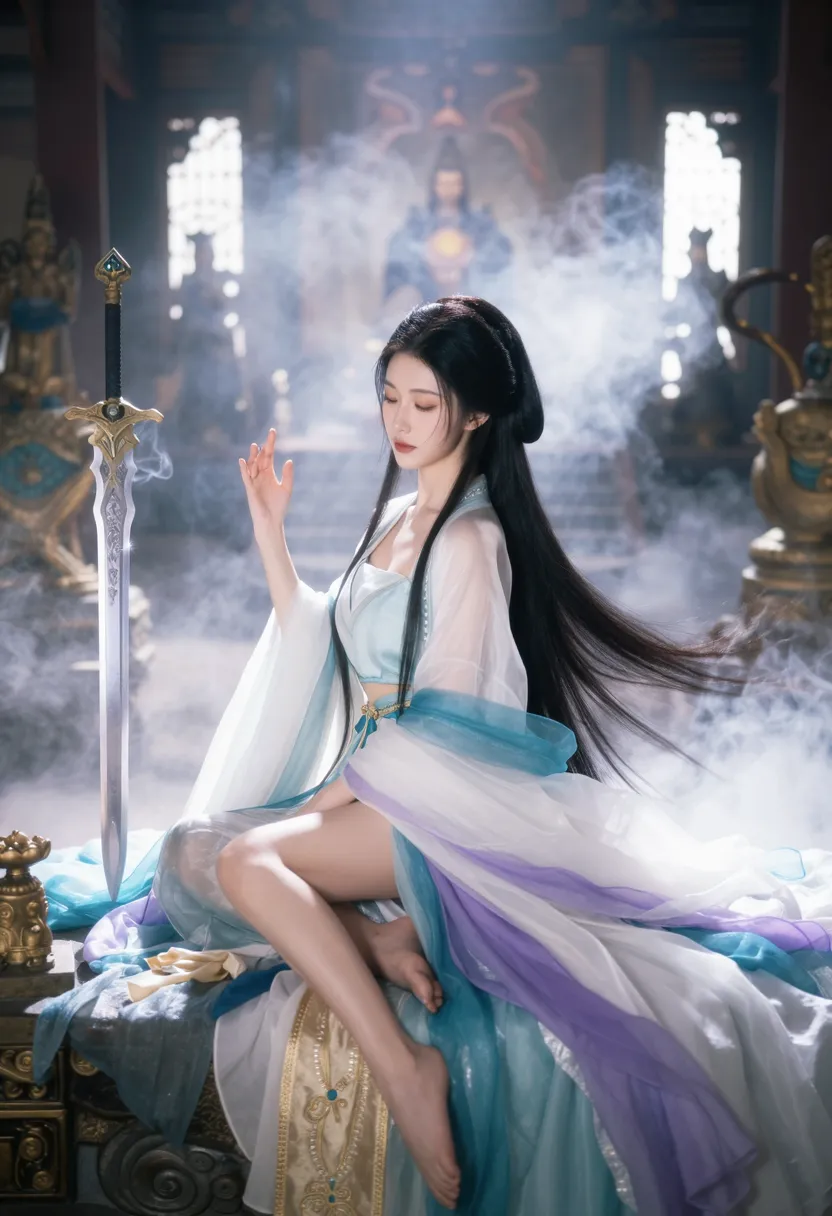 8K, ultra-detailed, masterpiece, best quality, intimate photography, sword pavilion art style, Asian female meditating in sword pavilion, wearing elegant cyan immortal outfit, long black hair in loose style, graceful and seductive pose, sitting in meditation position with sword floating beside, one hand in meditation gesture, other hand resting on knee, natural expression with closed eyes, ancient sword pavilion setting with immortal artifacts and mist, soft immortal light from windows, back view turning to side, sharp focus on face and sword, soft focus on pavilion background, dramatic lighting from immortal light creating soft highlights, contemplative atmosphere, serene color palette (cyan, white, gold, purple), 85mm f1.2, bokeh background