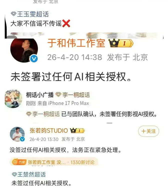 然而尴尬的是,名单公布后,多位上榜艺人迅速发布声明,否认签署过此类AI授权协议。