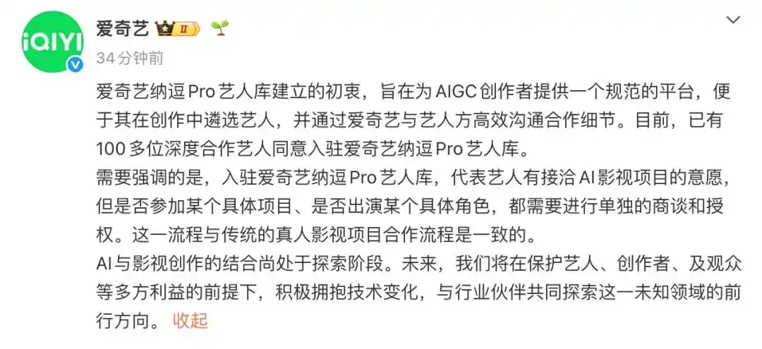 随着争议发酵,爱奇艺官方发文回应称:“入驻”仅代表艺人有接洽AI项目的初步意愿,并不等同于已授权,具体的数字形象使用仍需进行单独的商谈与签约。