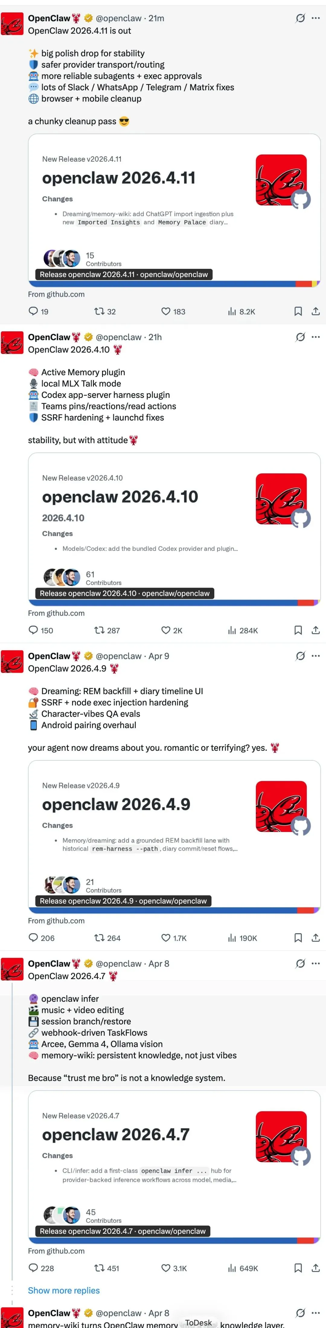 五天,五个版本号 —— 从 v2026.4.7 到 v2026.4.11,开源个人 AI 助手 OpenClaw(龙虾)在 GitHub 上完成了一轮堪称「火力全开」的密集迭代。