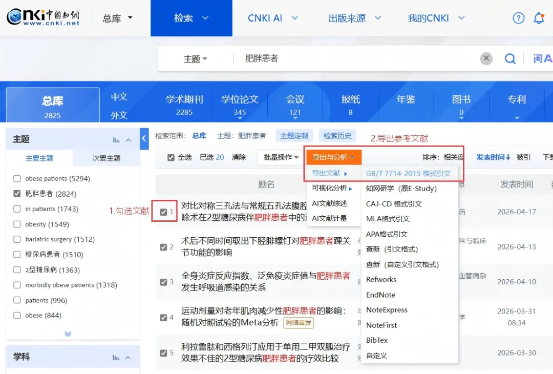 2. 勾选文献: 在文献标题前面的方框打钩(可以一次性勾选多篇)。