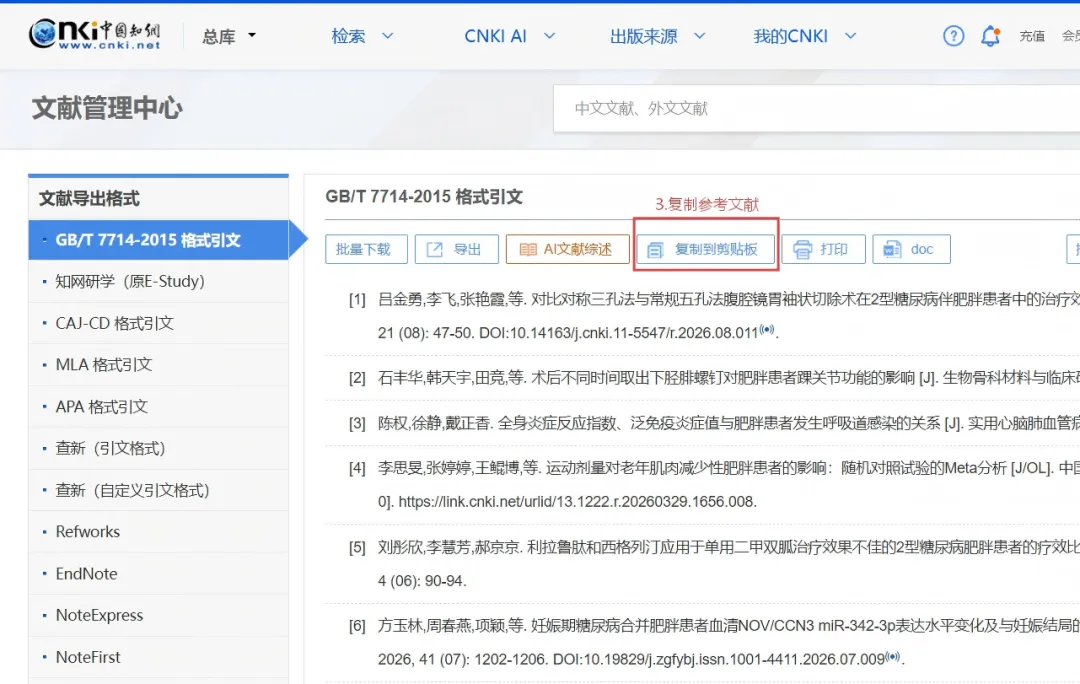 4. 选择格式: 默认通常就是GB/T 7714-2015格式引文(这是国内最通用的标准)。
