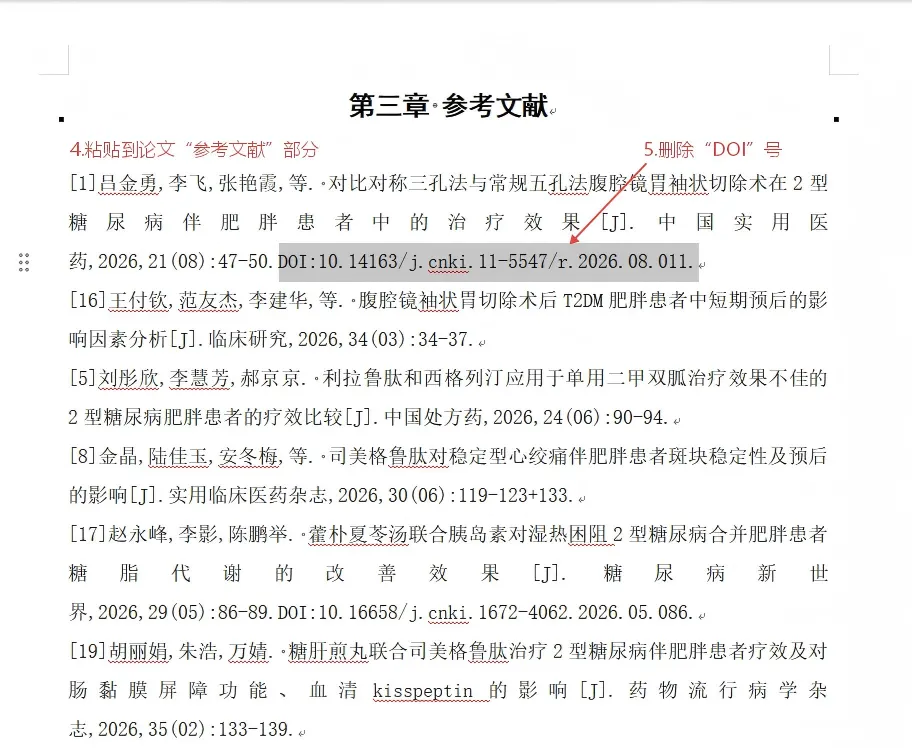 2. 删除多余信息:很多学校模板并不要求显示DOI号(数字对象唯一标识符)。