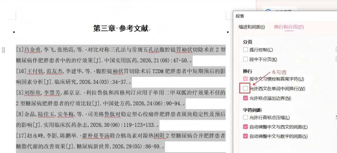 4. 设置悬挂缩进: 选中所有文献,右键点击“段落”,在“特殊格式”里选择“悬挂缩进”,值设为2字符。点击“换行和分页”选项卡,勾选“允许西文在单词中间换行”。