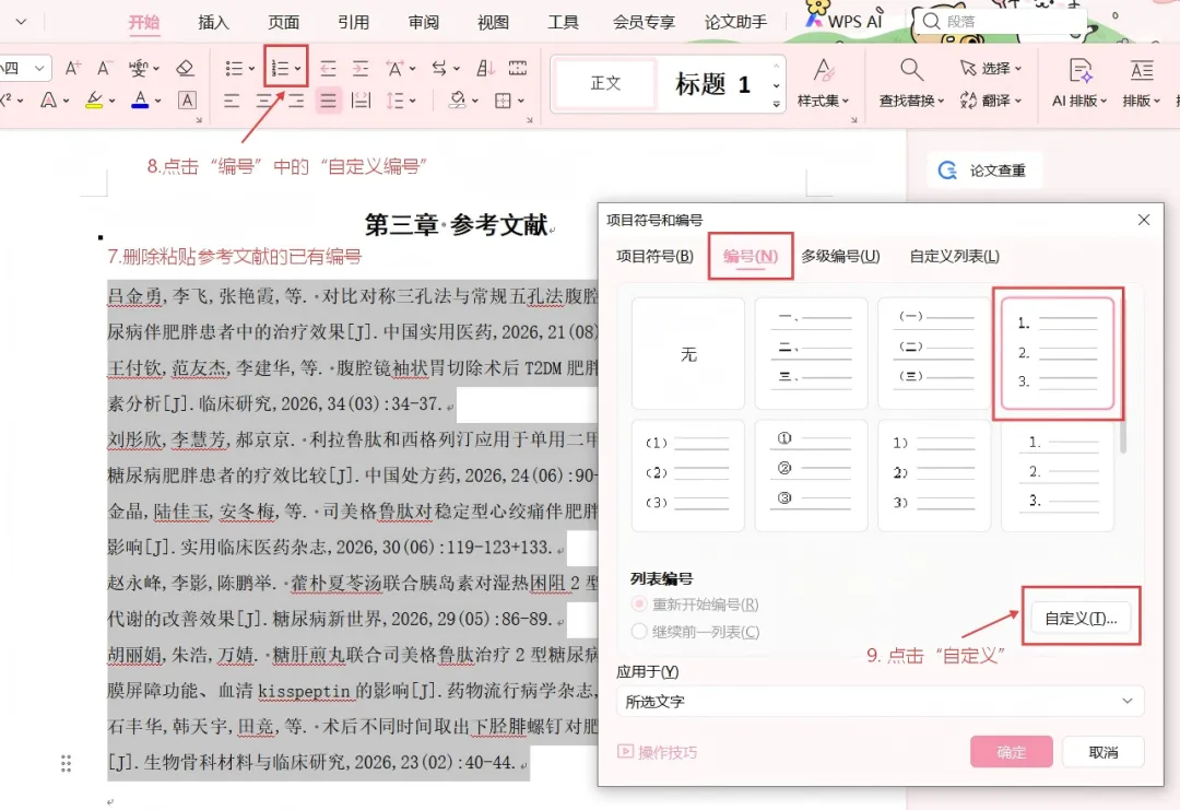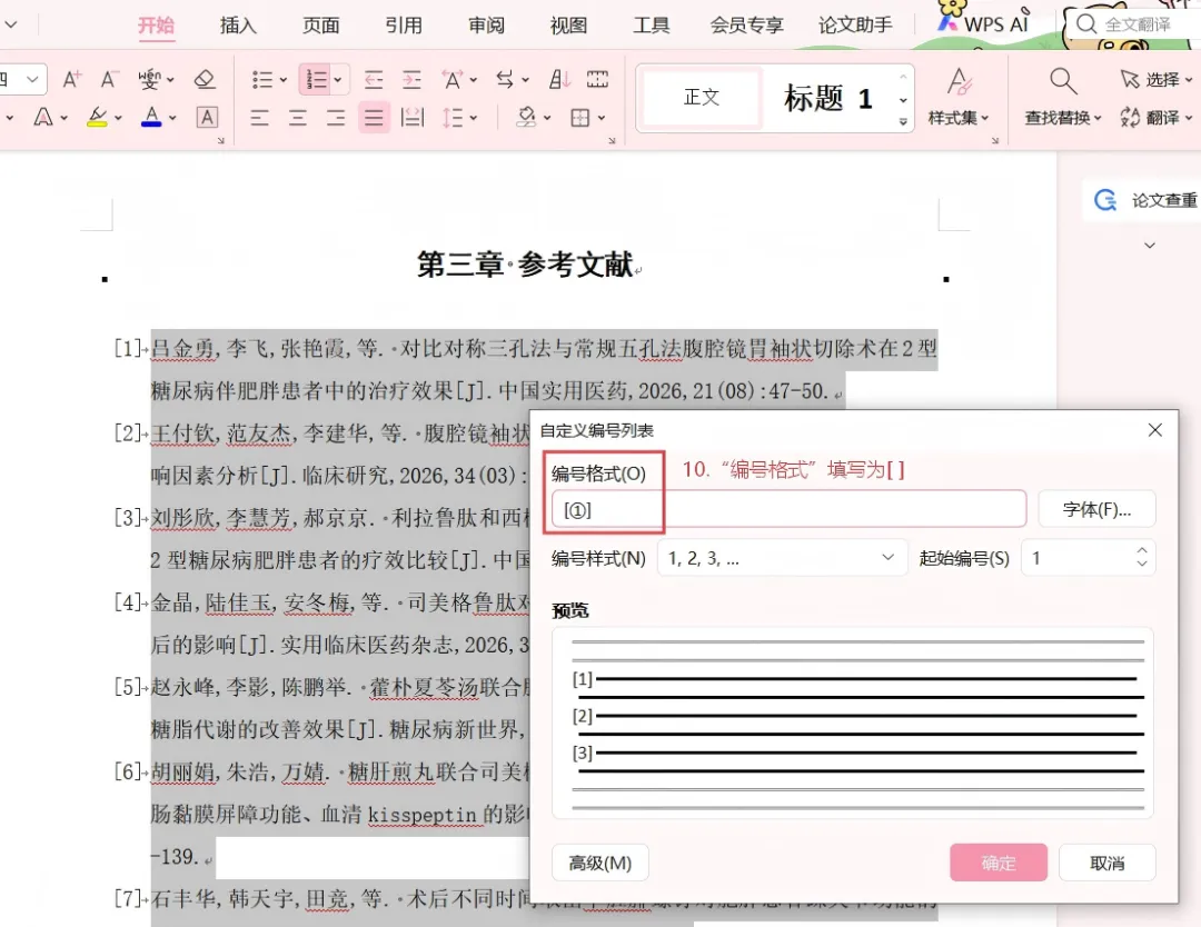 如果学校要求是[1]这种方括号格式,点击“定义新编号格式”,在编号样式里选“1, 2, 3…”,在“编号格式”框里,在数字前后手动输入方括号,变成[1]。