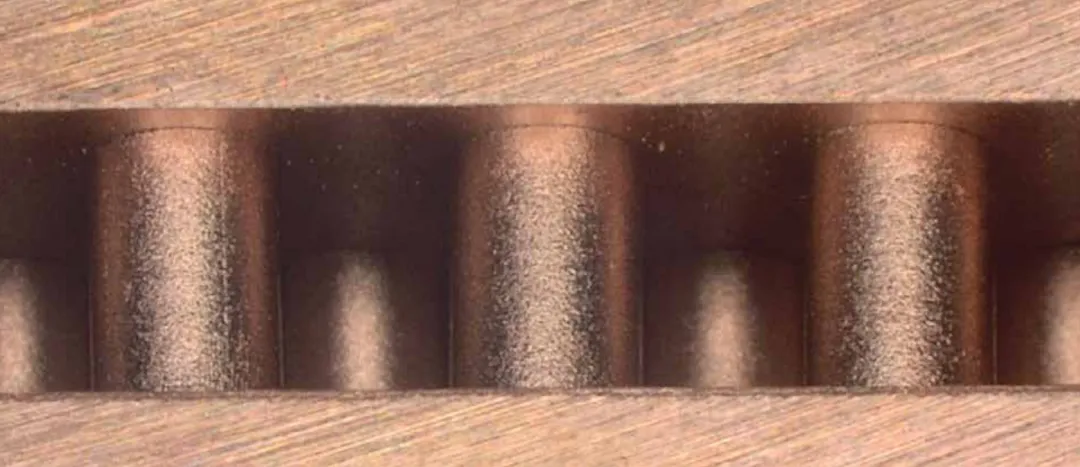 这张高倍显微截面图,是对“崩塌奇迹”最强有力的视觉证言。请将目光聚焦在画面中央那些粗壮的纯铜圆柱体上。在传统的制造逻辑中,带孔洞的底板和盖板需要被单独加工,然后再依靠一层薄薄的异质合金焊料(钎焊)将它们强行粘合。但焊料本身就是热量的绝缘体。而在这张图中,由于采用了MIM工艺,上下盖板与内部复杂的针柱阵列在火炉中共同经历了那场10%~20%的剧烈坍缩。在这个过程中,顶端与底端的铜原子跨越了物理的裂谷,完成了深度的固相扩散。这里没有焊缝,没有外来杂质,界面的概念在物理层面上被彻底抹除了。热量在穿过这些柱子时,面对的是一张完美连续的、接近全密度的单晶体网络高速公路。