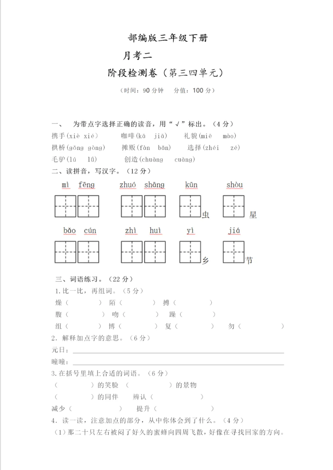 部编版3年级下册第二次月考测试卷3套,免费下载