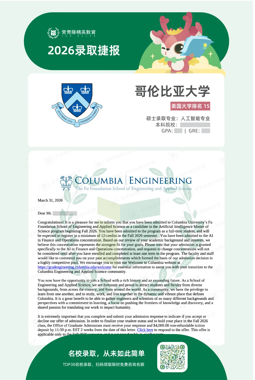 在系统、长期、精准的背景提升支持下,H 同学斩获Columbia University – Artificial Intelligence 硕士(首届)录取。