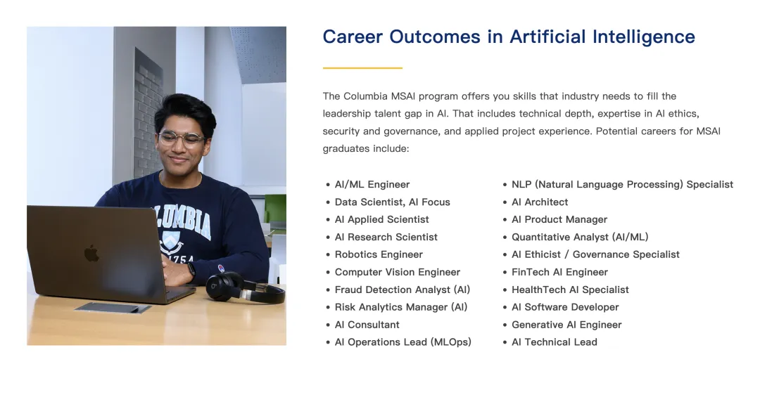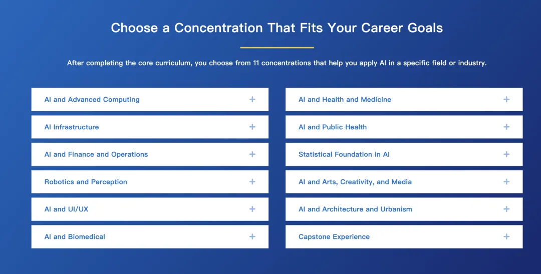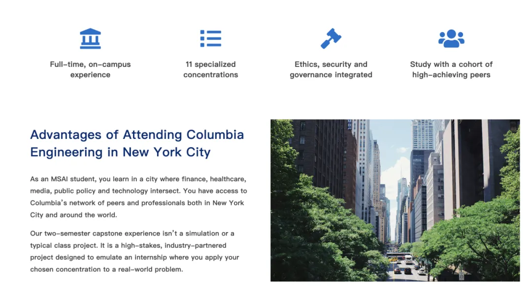 这是哥伦比亚大学今年首次设立的全新项目,T同学属于首届录取学生。该项目以计算机科学与工程为核心,构建了一套系统而严谨的AI课程体系,涵盖机器学习、深度学习、自然语言处理与计算机视觉等核心领域,同时结合多方向交叉应用路径(如金融、医疗、机器人等),为学生提供跨学科训练。