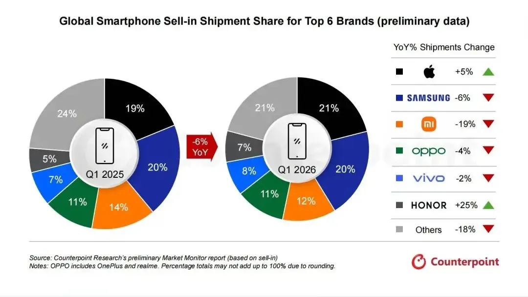 Counterpoint 最新数据报告显示,2026第一季度,全球智能手机出货量同比下降6%,但荣耀、苹果增长强劲,同比增长分别为25%和5%,是头部品牌中唯二实现正增长的手机厂商。