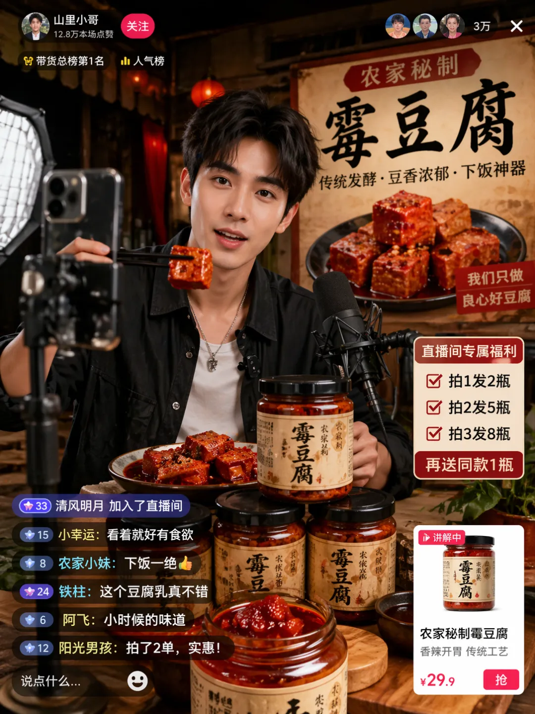 产品UI截图和原型演示。 需要做一个App界面的效果图给领导看?以前得打开Figma认真画。现在一句话描述就能生成带中文按钮、中文标签、中文导航栏的高保真界面截图。那张直播截图的UI元素准确到什么程度?关注按钮、弹幕区、购物车、价格标签,每一个组件的位置和样式都符合真实抖音的界面规范。