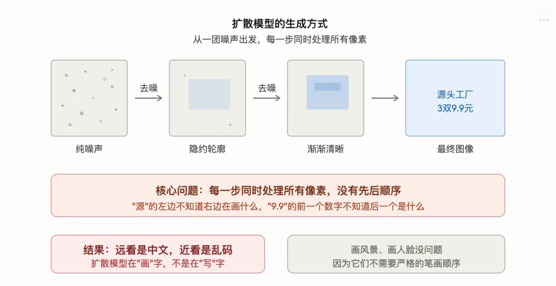 扩散模型的问题不是画得不够好,是它的生成方式和文字的本质需求之间存在根本矛盾。 文字需要笔画顺序和空间结构,扩散模型没有顺序的概念。