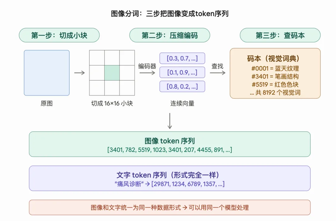 上一部分解决了一个前提问题:通过图像分词器,图像可以变成一串有空间顺序的token序列。