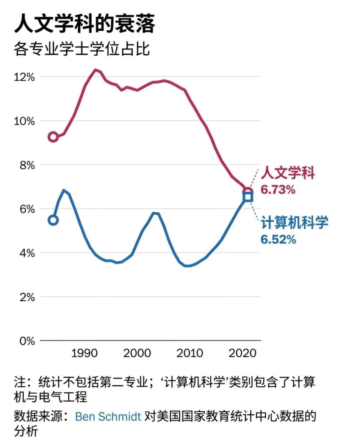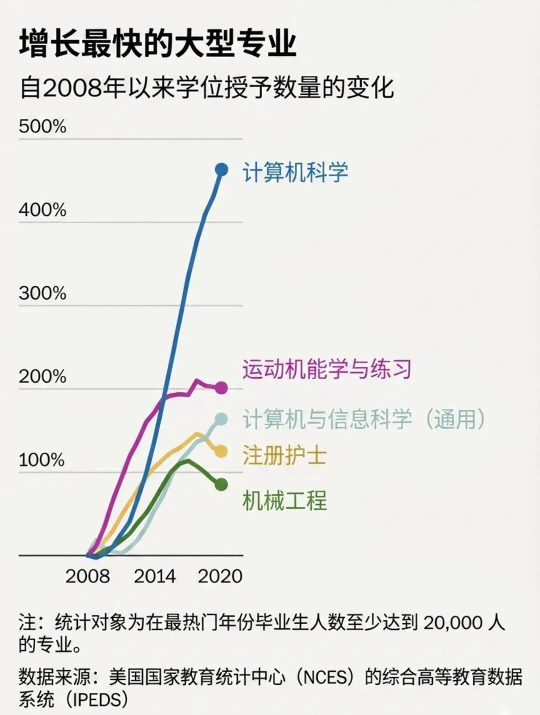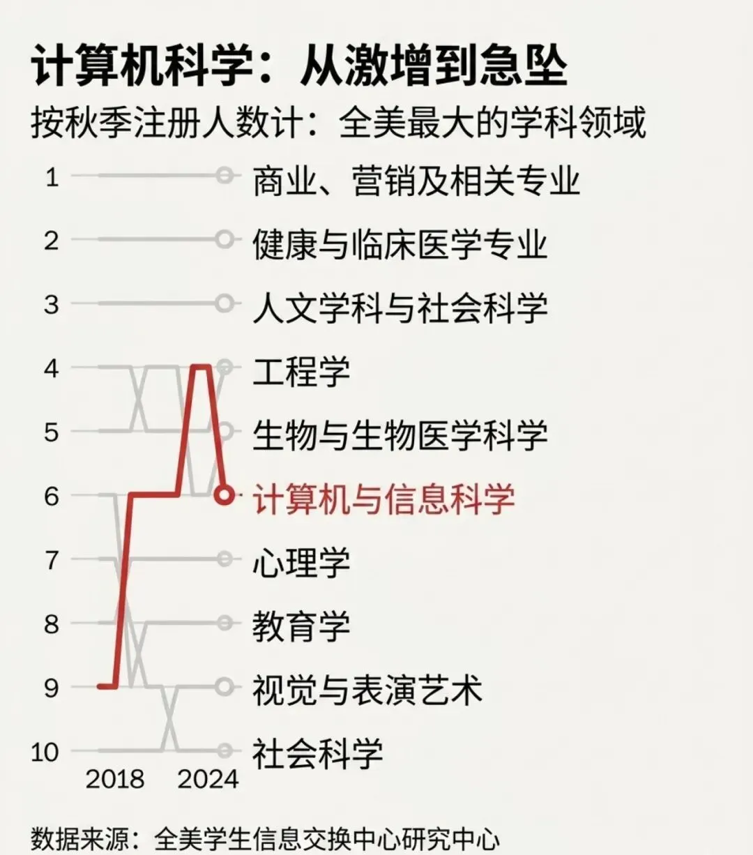 在我们把这一切归咎于对人工智能毁灭的恐惧并继续讨论之前,我们思考了一个问题:与上学年相比,本学年计算机科学专业的大学生人数减少了约5.4万人,那么他们都选择了哪些学科呢?(不是新闻学。我们已经核实过了。)
