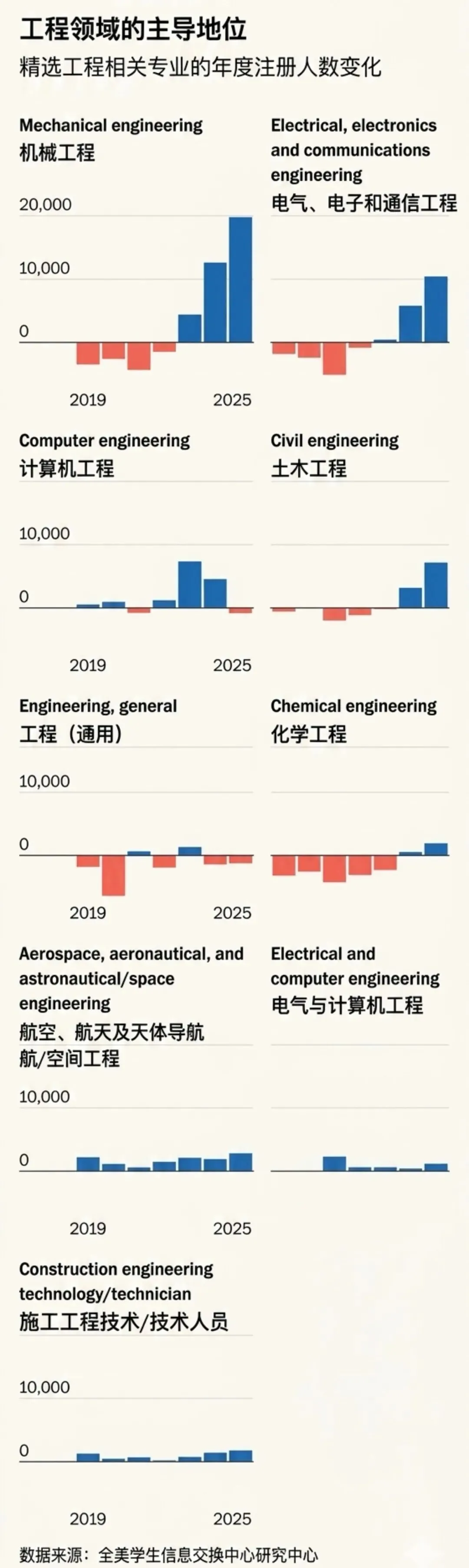 根据美国国家学生信息交换中心的数据,去年秋季计算机科学专业学生人数下降了8%,而工程专业学生人数则几乎相应增长了7.3%。在工程专业中,机械工程和电气工程专业的入学人数增幅最大,分别增长了11%和14%。